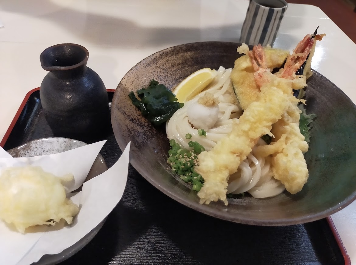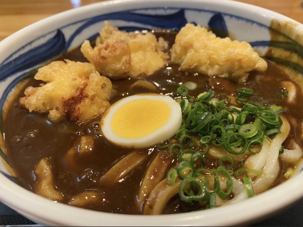 海老天カレーうどん…930円 当店のカレーうどんはとても濃厚でお客様から大変人気な一品です。特製のカレーうどんになると和牛+大海老2尾がはいっていてボリューミーなおうどんです! それでも物足りない方は同時に肉巻きおにぎりも大変おススメです! -