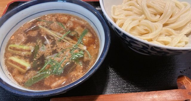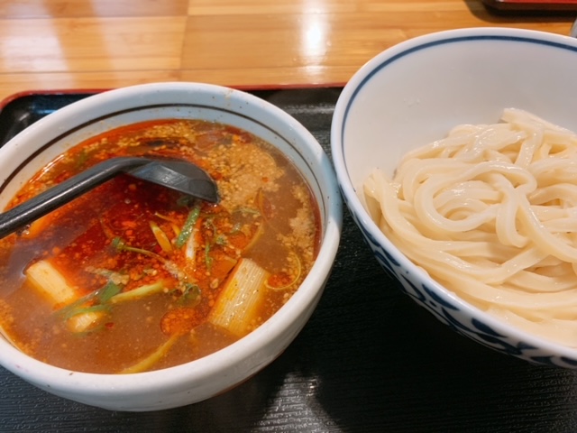 ‐赤い鶏つけ麺‐ 炙り鶏つけ麺の辛いバージョン。コチュジャンベースのタレが癖になる讃々のメニューで一番辛いおうどんです。温泉卵(80円)をトッピングしてまろやかな辛さを味わうのもおすすめです。